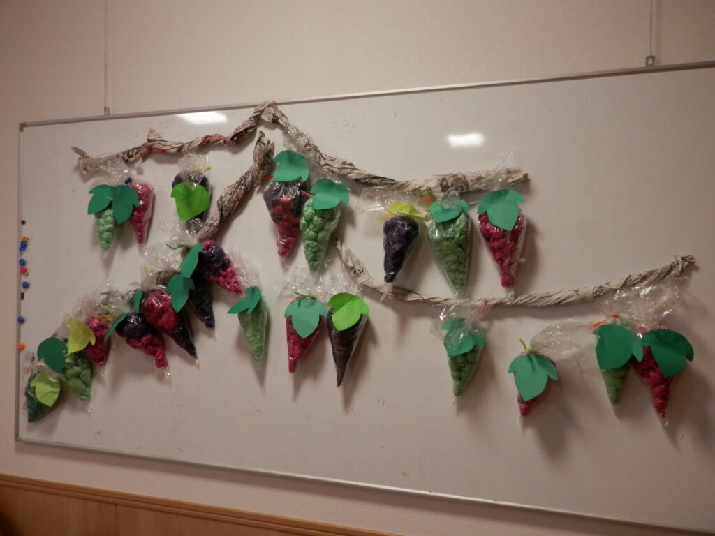 さて、今回の制作は秋の味覚ということで、みんなでぶどうを作りました。