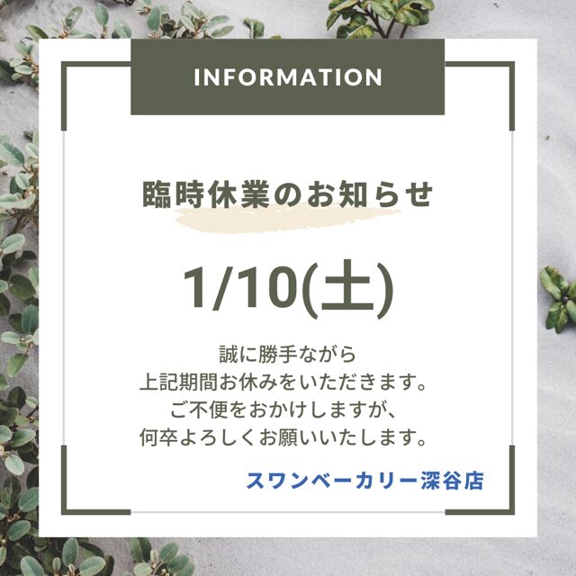 2026.01.07 スワン深谷スワン深谷臨時休業のお知らせ ポスト シェア はてブ 送る Pocket【臨時休業のお知らせ】誠に勝手ながら、1月10日(土)はお休みをいただきます。ご来店を予定されていた皆さまにはご迷惑をおかけしますが、どうぞご了承ください。FacebookXBluesky